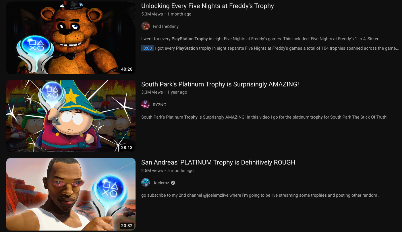 Sony dragged their feet when it came to replicating this system, finally introducing trophies in July 2008 and eventually making it mandatory for every title released on their platform the following year. Pretty much every game simply replicated their Achievements and Trophy lists, the only difference being trophies were assigned grades: bronze, silver, gold, and platinum, the last of which was only obtained if you earned every other available trophy. The platinum icon became a badge of honor for PlayStation gamers and became shorthand for 100%-ing a game. “Did you get the platinum?” “Are you going to get the platinum?” “How are the trophies/achievements?” In addition to the platinum, Sony also had the trophies earned feed into an RPG-like display of your trophy level. This level system became a quick reference to understand just how hardcore a particular gamer was. Given that I grew up within the PlayStation trophy ecosystem, I’m not sure if the Xbox 360 system of a singular number count of all Achievements was as quick to understand comparatively. It was the devaluation of this leveling system in their 2020 update, extending the levels from 100 to 1000, that entirely killed any trophy hunting enthusiasm that remained within me. Despite my personal burnout late in the game, an entire genre of YouTube video was born out of the chase for Achievements/Trophies. Naturally commercial incentive to put out games with easy trophies as a way to draw in that crowd for a quick cash injection followed.
