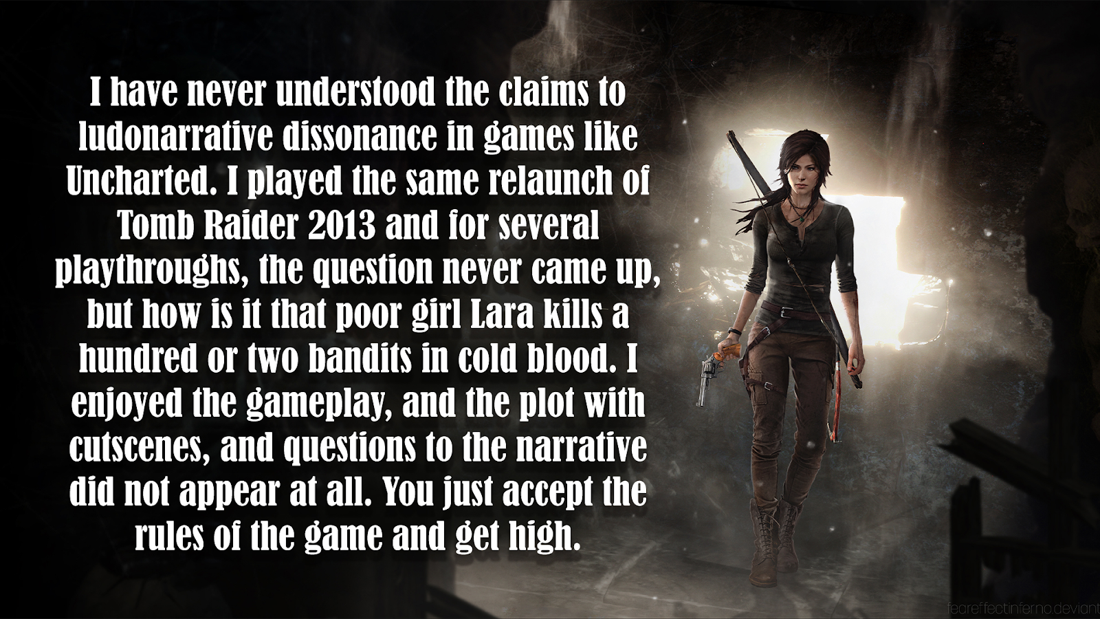 The attitude expressed in the image above is the problem with games, the problem that makes them very insular despite the massive market games have captured. Games have a language that is illogical to anyone on the outside, and is so overwhelmingly accepted without a second thought by the ones on the inside, that I don’t think these contradictions that litter every major release will ever be resolved.
