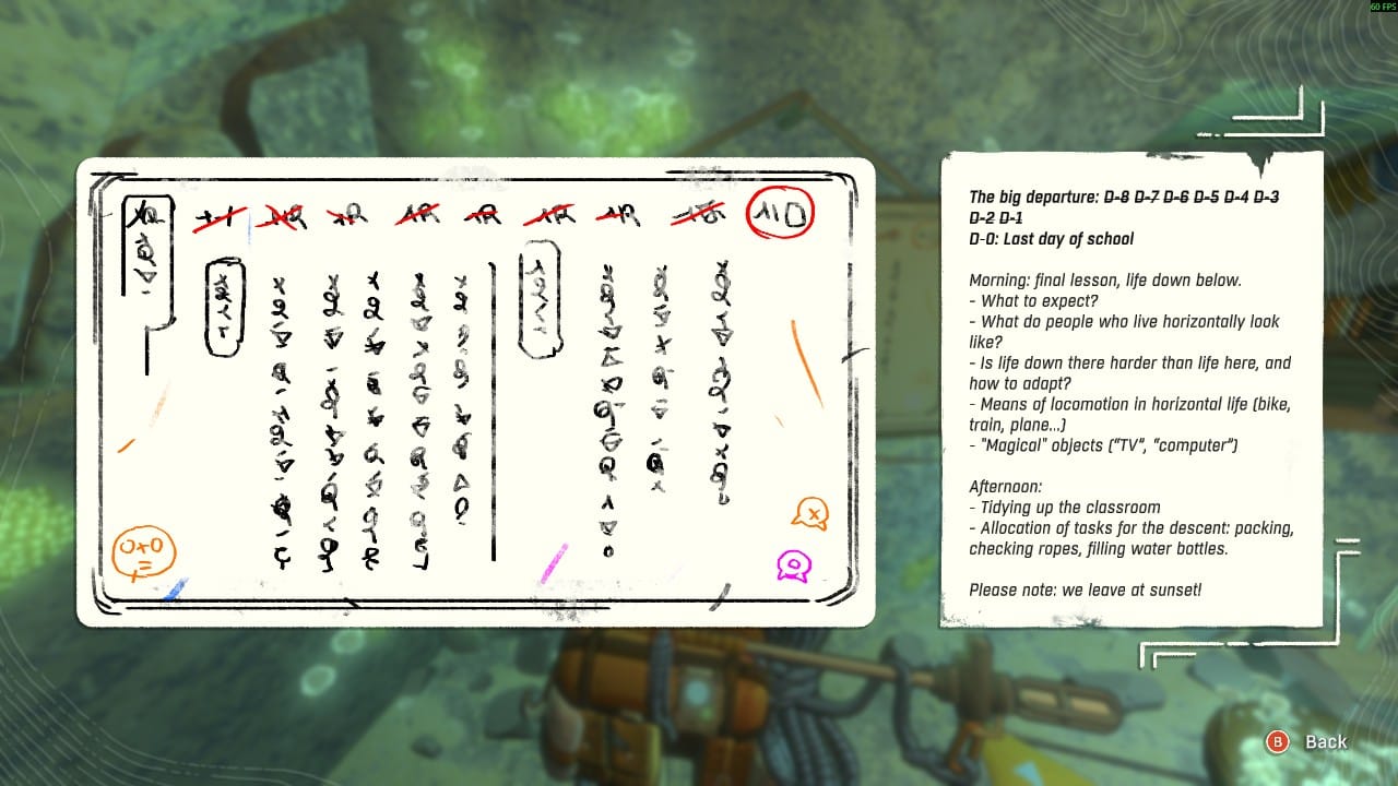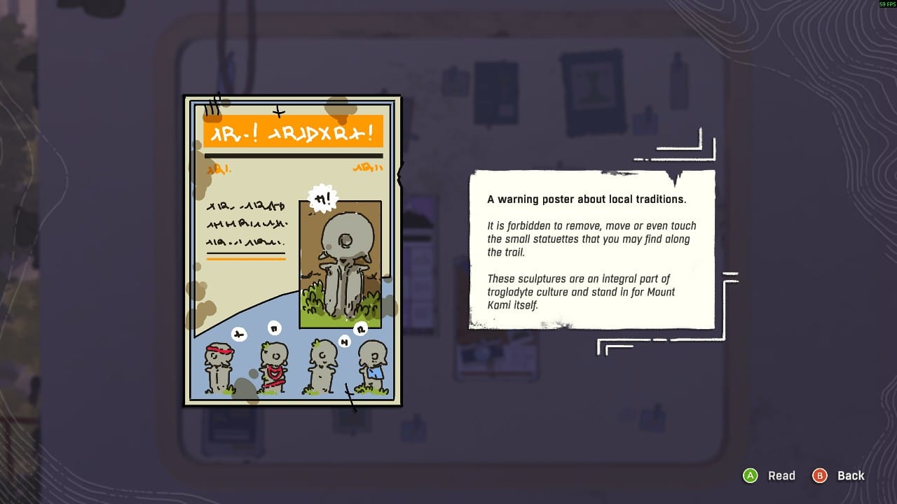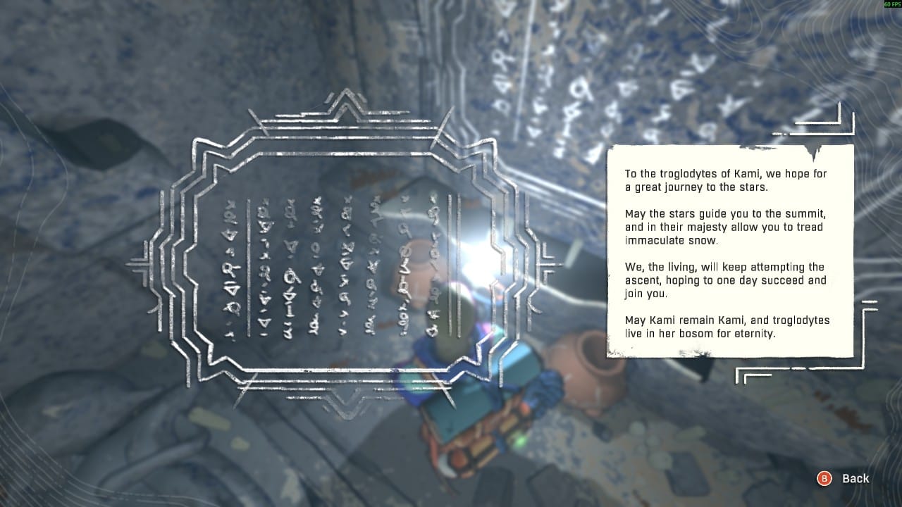 Troglodytes in Cairn tap into some similar tropes about cultures that never reached an industrial revolution, that exoticizes them. Aava can come across troglodyte pitons, made of unknown material that are indestructible unlike your modern ones. This plays into a larger conservative trope found within a ton of fiction: ancient lost civilizations that are somehow more advanced than our current one. Simplified: things used to be better in a fantasized past. There is a note about the “magical” objects that await the troglodytes below the mountain: TVs and computers. As an ancient "unenlightened" culture they are much more spiritual than any indication we receive from Aava or Marco or the other people met on Kami. Their eventual absorption into the larger, “modern” world presents them as a backwards, out of time people. One whose only salvation from extinction was to give up and assimilate. These were people who were entirely self-sufficient and existed for centuries prior to their “discovery” by the rest of the world. Why did their numbers all of a sudden begin to dwindle? One letter you find offers an explanation, “most people had already left, and the few that remained were all too eager to discover the world below. So it goes, the age of the troglodytes has passed.” Enticed by the world below, they descended and left Kami empty.