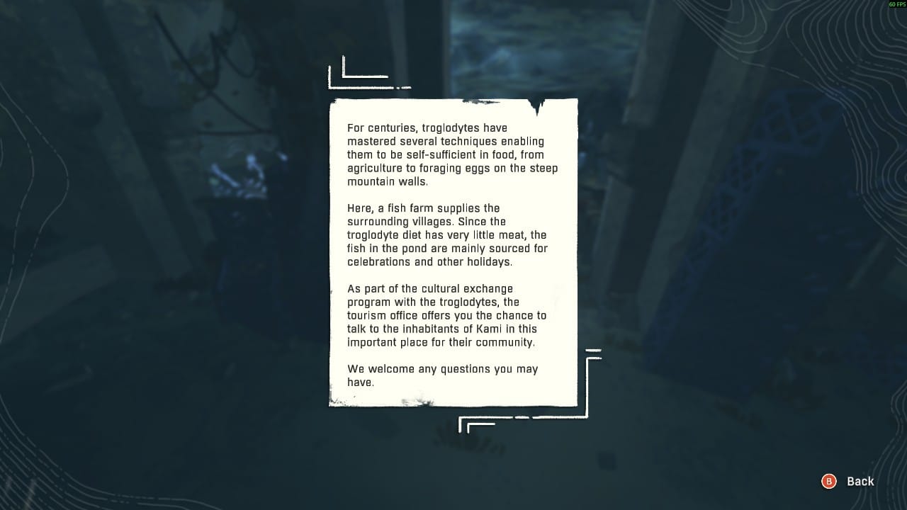 Prior to their abdication of Kami, there was a “cultural exchange program” when the cable car was functioning, in which tourists could speak with a troglodyte and learn about their culture. “At first I thought I was dealing with illiterate, uncultured villagers, but it's nothing of the sort. They have their own school, knowledge, and literature. In many regards, troglodyte culture is older than our own, we’ve just taken different paths.” Why then choose the word troglodyte to be the name of these people if they are intentionally not fulfilling the imagery behind that word? It is such a confusing choice given that they came up with Kami for the name of this game’s fictional Mount Everest. Why then not come up with a similarly fictional name for its abstraction of the native sherpa people of the Himalayas?
